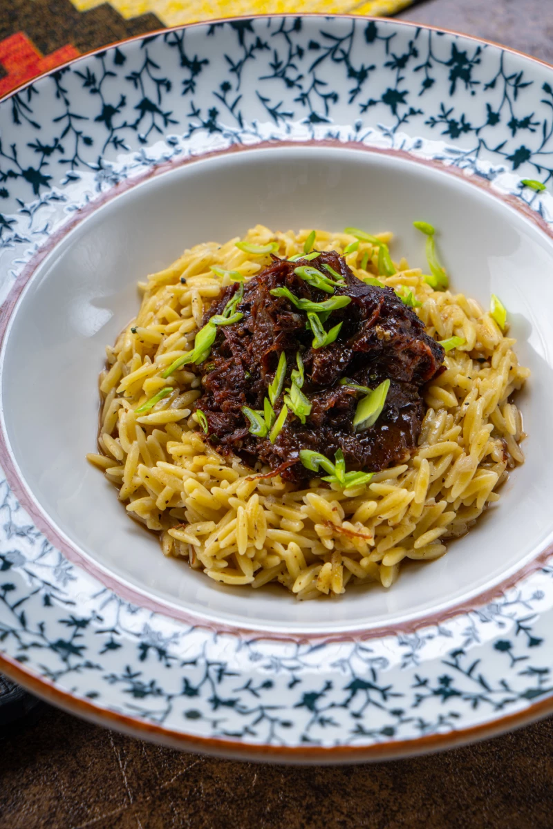 Говяжьи щечки, пасто орзо, пармезан, сливки, зеленый лук соус демиглас, чесок, трюфельная паста