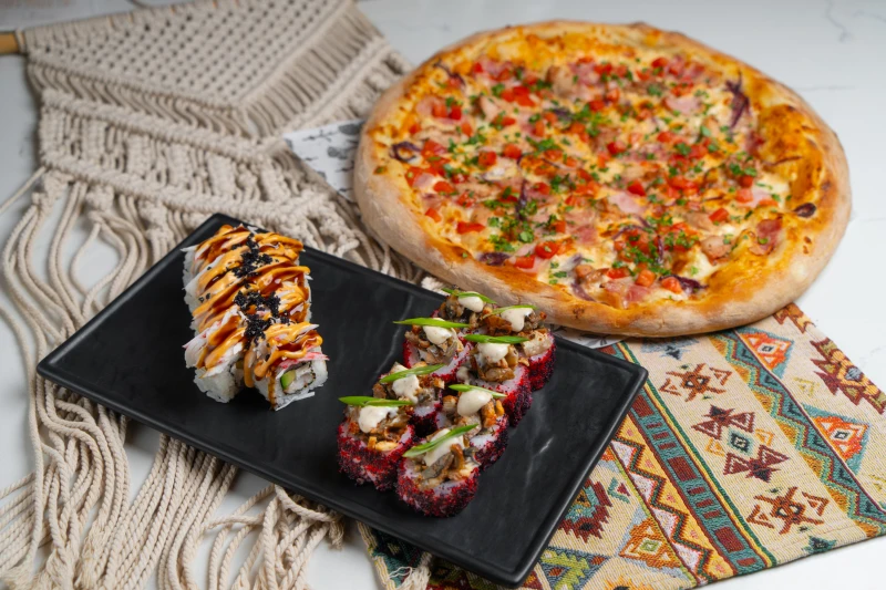 Пицца Мясная, Ролл с угрем, Нежный краб.