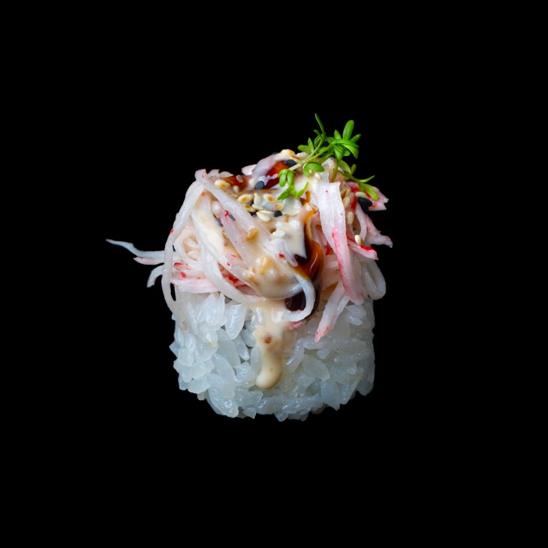 Сливочный сыр, огурец, терияки соус, кунжутный соус, жареный лосось, имитация краба, кунжут.