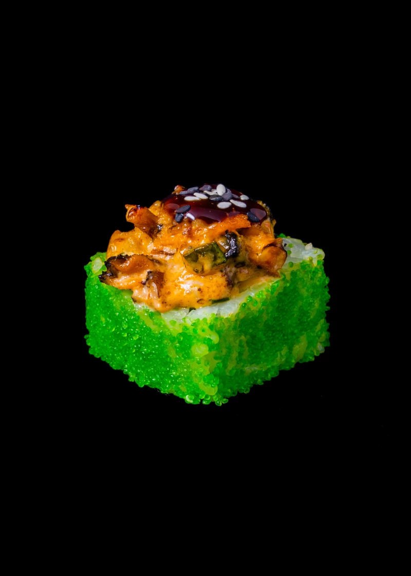 Сливочный сыр, омлет, мясо мидии, лук зеленый, спайси соус, икра масаго
