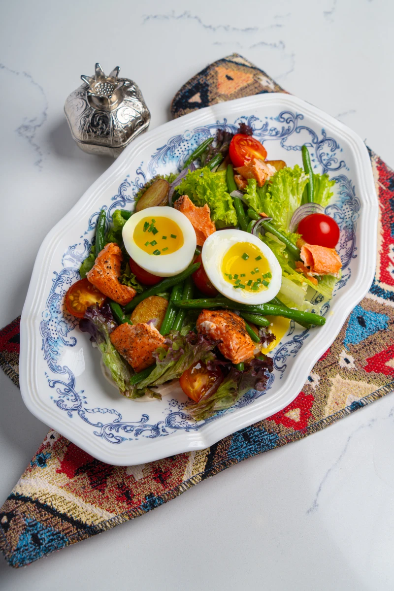 Соус тоннато (тунец консервированный, сливки, майонез, каперсы, чеснок, пармезан, масло оливковое), запечёный лосось, микс салата, стручковая фасоль, бейби картофель, томаты черри, вяленые маслины с КОСТОЧКОЙ, яйцо, красный лук, лук резанец
