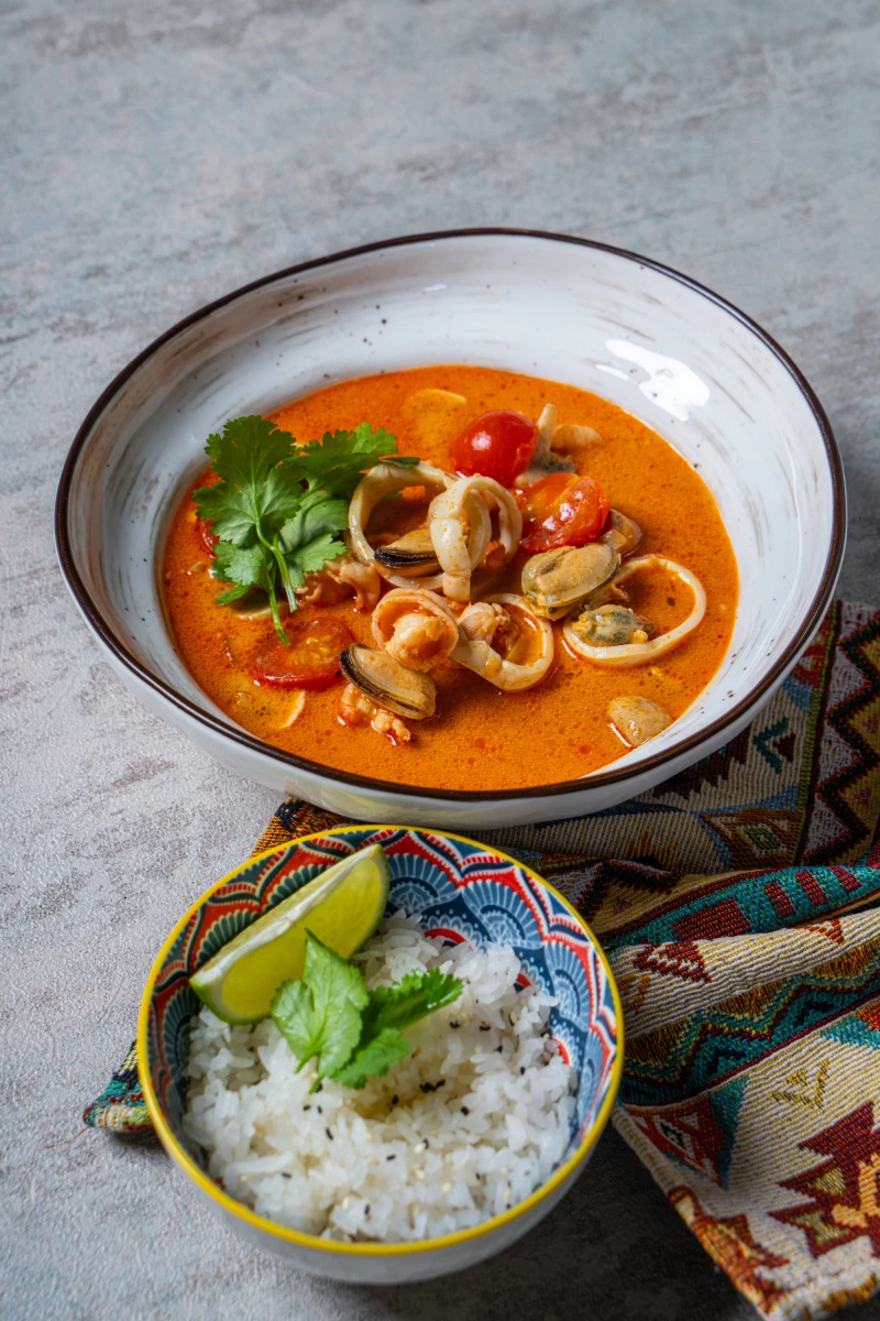 Куриный бульон, паста том ям (лемонграсс, соевое масло, сахар, лук-шалот, галангал, красный перец чили сушенный, чеснок, соль, креветки, кафирский лайм, рыбный соус), креветки, мидии, кальмар, томаты черри, чеснок, чеснок, имбирь, лук, рис, лайм, кинза, кунжут